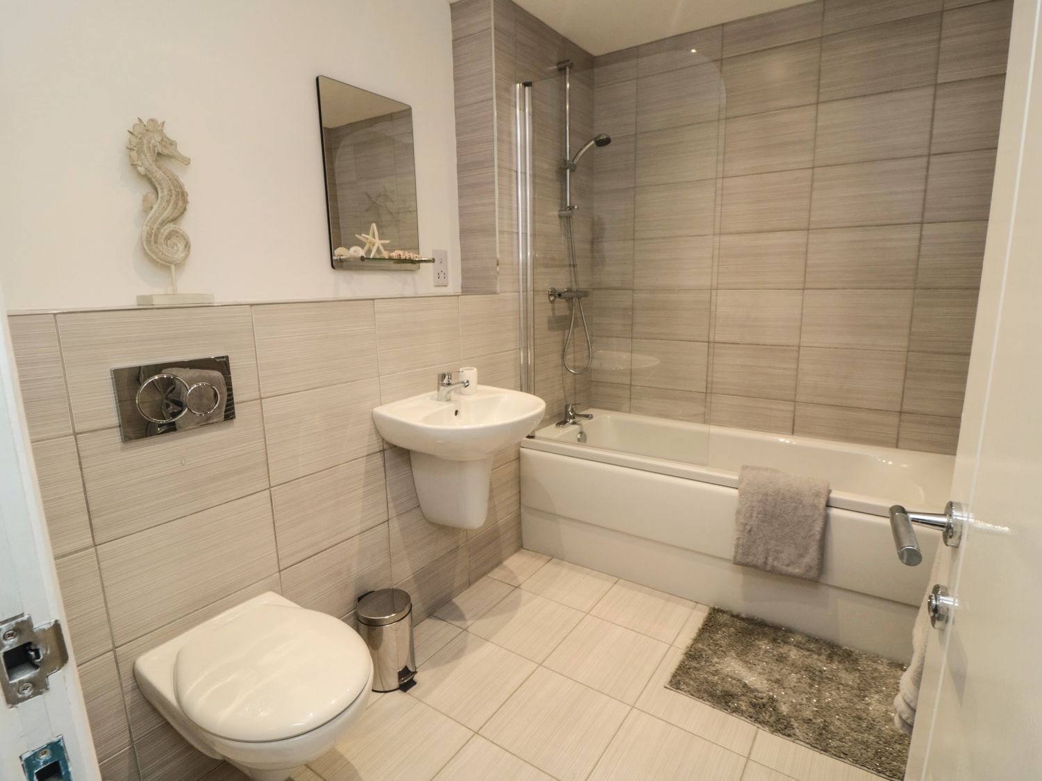 Once you've whipped up a culinary delight for all to enjoy, settle down at the breakfast bar or at the dining table by the floor-to-ceiling windows. As the day winds to a close, head to bed in a marvellous king size bed that features calming blue tones throughout and benefits from an en-suite shower room; the second bedroom has a delightful triple sleeper. Continue along the corridor to find a contemporary bathroom, where a soak in the bubble bath awaits after a day out at the beach.