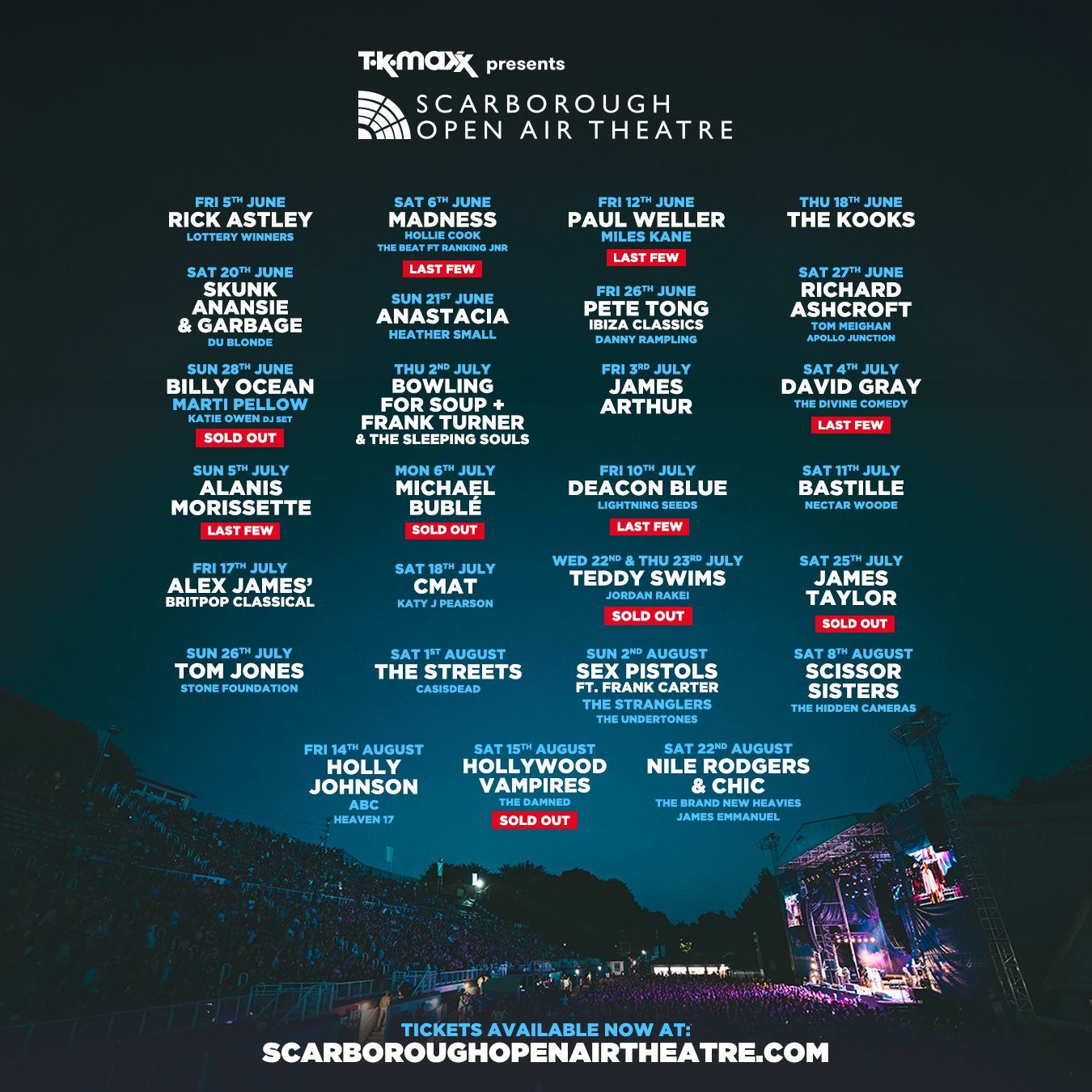 Scarborough Open Air Theatre is Europe's largest open air theatre with a capacity of around 8,000. Find out who's coming in 2026!
