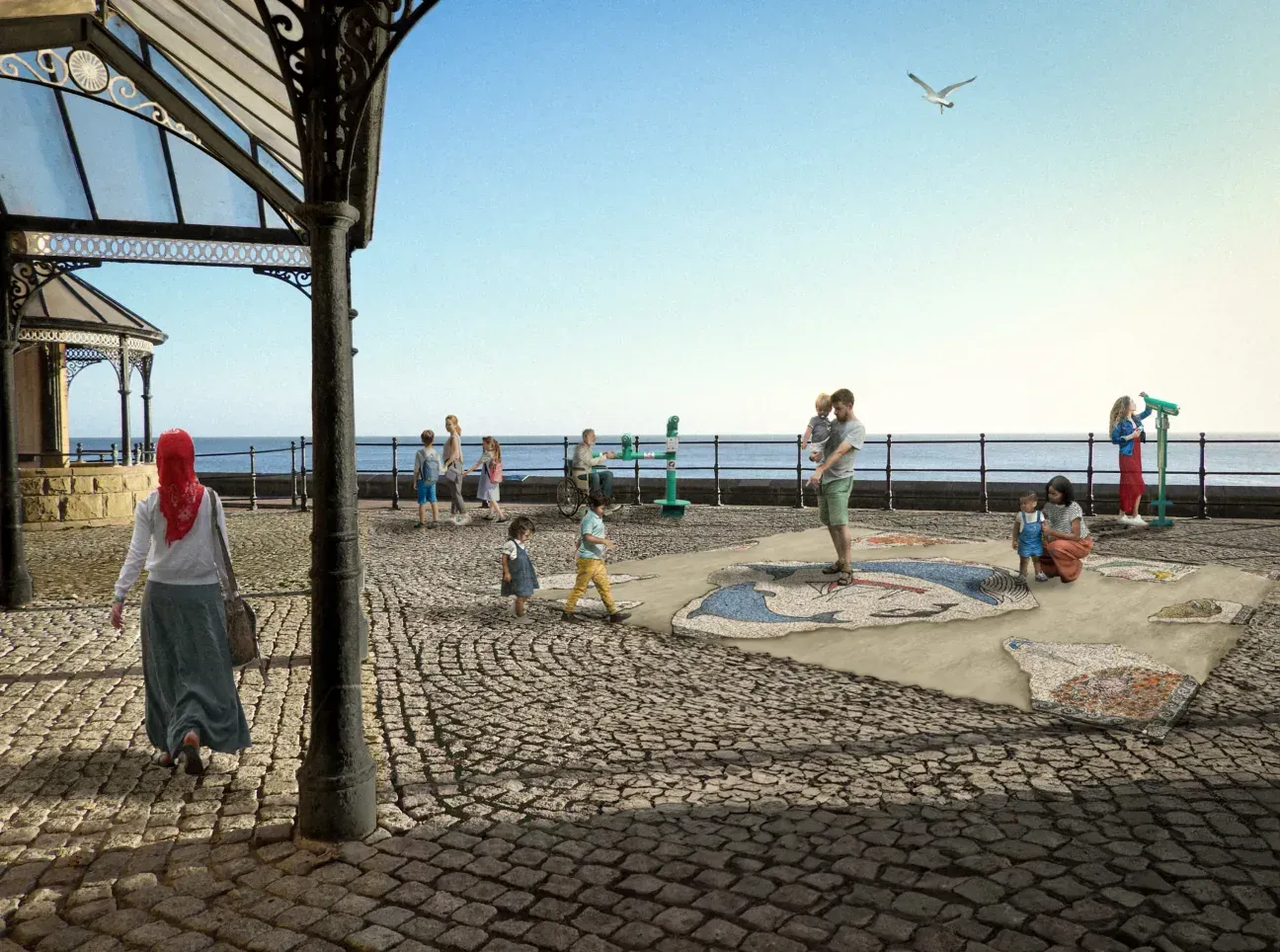 The sixth and final work of the Wild Eye series is a new Seawatching Station featuring a permanent artwork commission by Turner Prize-winning artist Jeremy Deller – launches this Saturday 26th April. Located on Marine Drive – one of the best spots on the English coast for observing dolphins and porpoises, with over 350 sightings in the past year – the Seawatching Station offers free telescopes and comprehensive wildlife information, providing insight into the area’s remarkable marine life. Deller’s new artwork, Roman Mosaic c. 2025, created in collaboration with sculptor and mosaic artist Coralie Turpin, is an integral part of the Seawatching Station. This large-scale, fragmentary Roman-style floor mosaic is inspired by Scarborough’s marine life and Roman heritage. Roman Mosaic c. 2025 has been developed in consultation with local scientists, conservationists, archaeologists and community groups and builds on Jeremy Deller’s long-standing fascination with cultural history. The facility is free to enjoy and will be accessible 24/7.